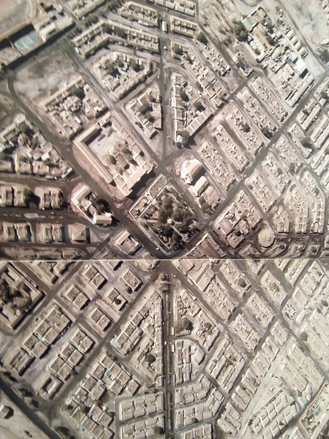 We went to María Elena and things happened like, for example, that on route a pig appeared and it occurred to me to use the pig as a kind of protagonist. My projects are never descriptions of a place. They are certain suggestions of these heterotopic places. The idea here is to create a kind of story about this place, also thinking a lot about painting. We couldn't see the place from above but we did see images previously and material that Alexia had collected. From above, María Elena, the nitrate fields, in my opinion form a very pictorial palette of colors. We talk a lot about this and how to develop a fiction, following another project I did, Fordlandia, thinking about the idea of working with different landscapes (in that case very tropical and now very arid).